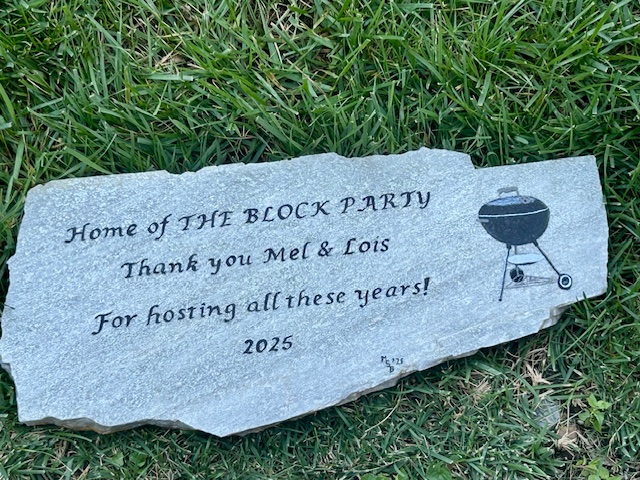 On behalf of the neighborhood, Jolene Struebbe (Beechwood Avenue) presented a commemorative stone to Mel and Lois thanking them for both creating and hosting such a wonderful all-inclusive neighborhood event for so many years!
